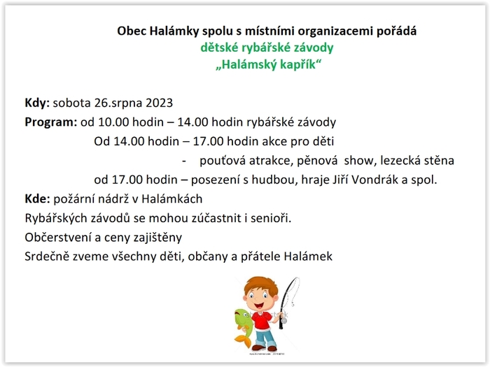 Dne 26.8. v době od 10:00 hodin se v obci Halámky uskuteční oblíbené dětské rybářské závody "Halámský kapřík".