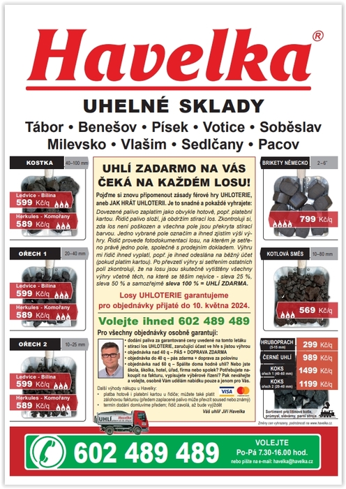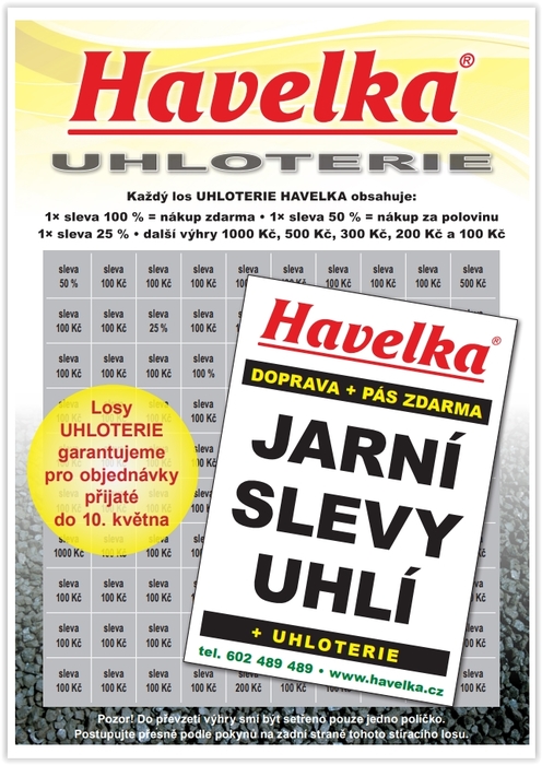 Havelka uhelné sklady nabízí jarní slevy na prodej uhlí, briket a koksu s dopravou a pásem zdarma. Navíc s jistou výhrou v UHLOTERII, Akce platí do 10.května!Objednávky na tlf. čísle 602 489 489