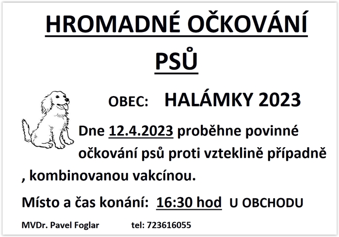 Dne 12.4.2023 proběhne povinné očkování psů proti vzteklině, případně kombinovanou vakcínou.Místo a čas konání: 16:30 hod U OBCHODUMVDr. Pavel Foglar tel: 723616055