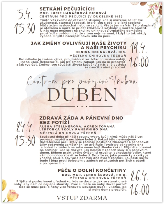 V přiloženém letáku najdete "Program Centra pro pečující Třeboň" na duben 2023